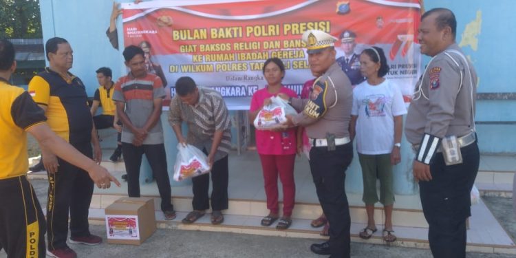 TAPANULI SELATAN-Dalam rangka menyambut HUT Bhayangkara ke-77, Polres Tapanuli Selatan (Tapsel) menggelar Baksos dengan agenda berbagi sembako dan korve di Gereja HKBP Kelurahan Huta Tonga, Kecamatan Angkola Muaratais, Senin (19/6/2023) siang.